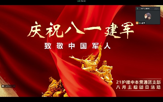 202288日,2021级护理(中本贯通)班团支部通过腾讯会议,于线上开展了以“庆祝八一建军节,致敬中国军人”为主题的主题团日活动。