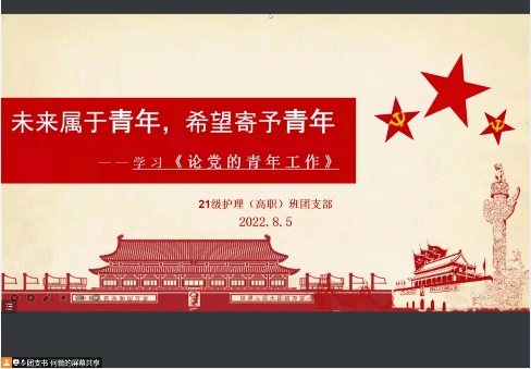 202285日,21级护理(高职)班团支部通过线上会议的方式开展了以“未来属于青年,希望寄予青年”为主题的主题团日活动,本次活动围绕《论党的青年工作》一书展开学习。