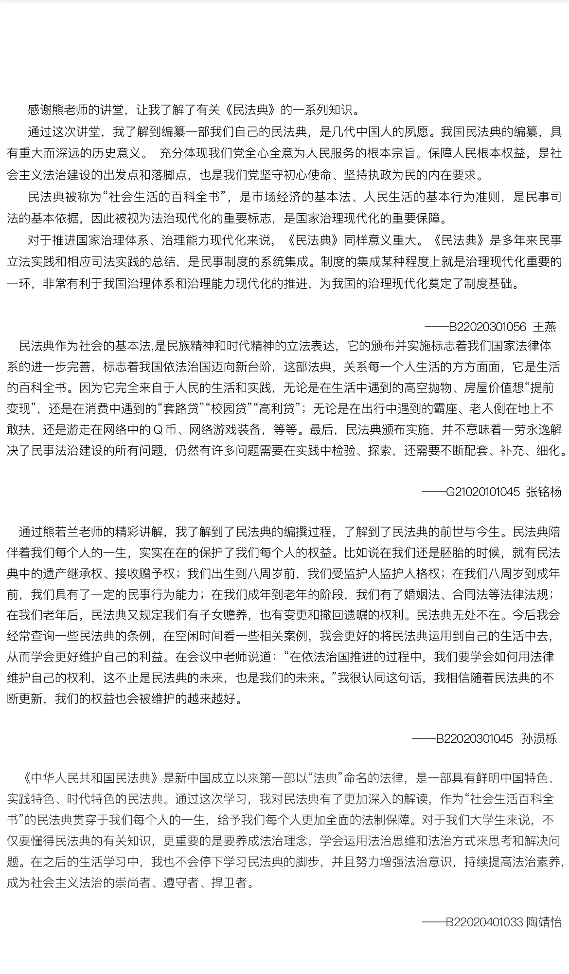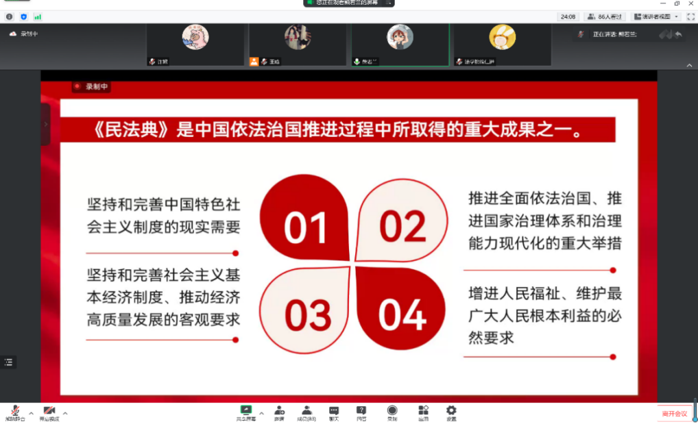 2022年是党的二十大召开之年,也是“八五”普法的关键之年十年间,我国法律体系日益完备,其中最具代表性的是新中国第一部以法典命名的重要法律——《民法典》完成编纂并颁布实施。熊若兰老师首先带领我们学习了《民法典》与二十大的联系:《民法典》是依法治国推进进程中重大成果之一。除此之外,我们也体验了从时间这条历史长河上纵观了《民法典》的编纂过程。