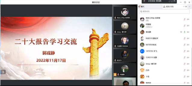 郭戎静首先分析了“报告的要点及框架”,深刻认识大会召开的意义与主题、然后分别以“奋进新时代”、“贯彻新思想”、“擘画新蓝图”、“启航新征程”四个方面详细导读,分享学习感悟。她指出,党的二十大报告总揽全局、气势恢宏,思想深邃、内涵丰富,通篇贯穿坚定的信念追求、强烈的使命担当,更是推动中国特色社会主义不断前进的政治宣言、理论纲领和行动指南。