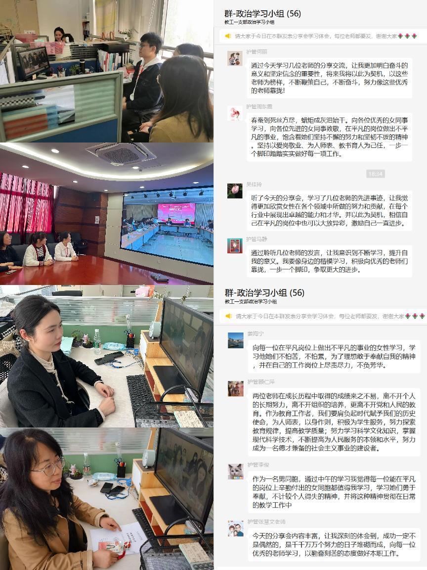 在“三八”国际妇女节到来之际,3月7日下午,学校举办了“巾帼心向党,奋进新征程”为主题的“她”成长分享会。此次分享会邀请了bwin中国官方网站2022年世界技能大赛特别赛团队成员和其他3位在岗位上做出不平凡贡献的女教师共同分享她们成长的心路历程。学院党总支书记郭戎静、党总支副书记、院长朱爱勇、徐淑芹老师、吴怡欣老师到现场参会,学院其他教师113人通过线上直播的方式观看学习了此次分享会。会后,大家在政治学习组内纷纷表达了学习感悟。