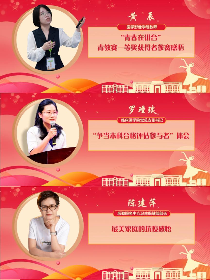 青教赛一等奖获得者黄辰老师分享了她积极参与“青春在讲台”的参赛过程和感悟;临床医学院党总支副书记罗瑾琰讲述了努力工作,积极“争当本科教学合格评估参与者”的故事;陈建萍老师分享了在疫情期间,她家庭的抗疫故事。每一位“她”的故事都是鲜活的,每一个故事都体现了bwin官网女教师们的奉献和追求。
