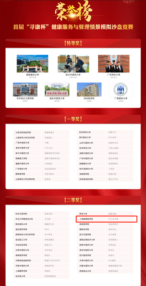 2022年11月26日-27日,浙江中医药大学主办的首届全国健康服务与管理教育高峰论坛暨首届“寻康杯”全国健康服务与管理情景模拟沙盘竞赛中,bwin官网收获5个奖项。bwin中国官方网站健康服务与管理教研室主任赵芳副教授、孙珊珊老师作为指导教师,2019级健康服务与管理专业王雨豪、焦佳璐、王柯懿3名同学共同组成的“开心向日葵”代表队喜获两项大奖:“全国健康服务与管理情景模拟沙盘竞赛”二等奖, “最佳健康管理方案奖”。同时, 在“全国首届健康服务与管理专业优秀论文评比”中,2018级健康服务与管理专业毕业生钟思宜(指导教师赵芳)、宝云(指导教师孙珊珊)、王福林(指导教师赵芳)分别荣获一等奖、二等奖、三等奖。