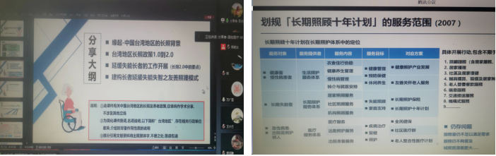 王淑宜副总监进行了《建构推迟失能失智之长者友善照护模式》主题报告。在报告中,介绍了我国台湾地区长期护理与社会照护事业发展规划与历程,解读了台湾卫生保健相关政策,并对“长期照护十年计划”、“台湾长期照护2.0计划”的具体举措进行了详细说明。