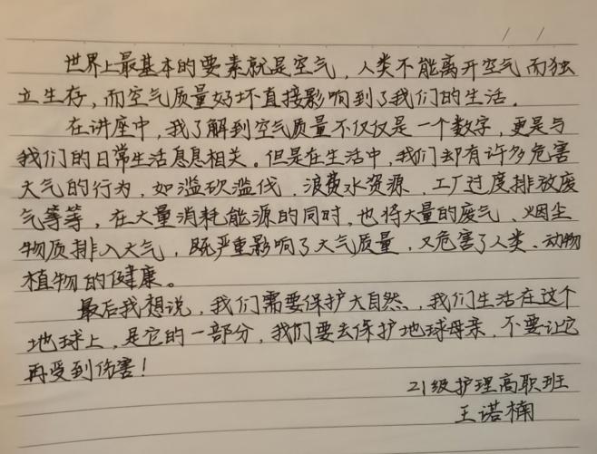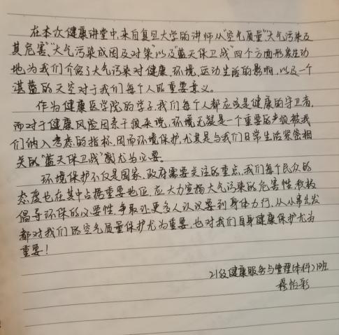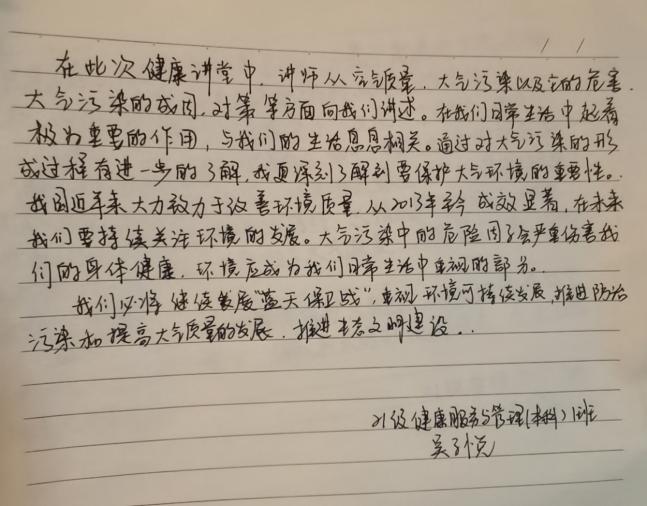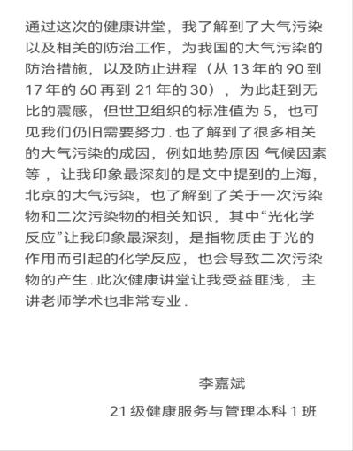 薛淑蕙老师1小时精彩的健康讲堂内容丰富充实,引发了同学们对大气污染问题热烈的讨论和思考,收获良多,下面来看看大家的感受吧~
