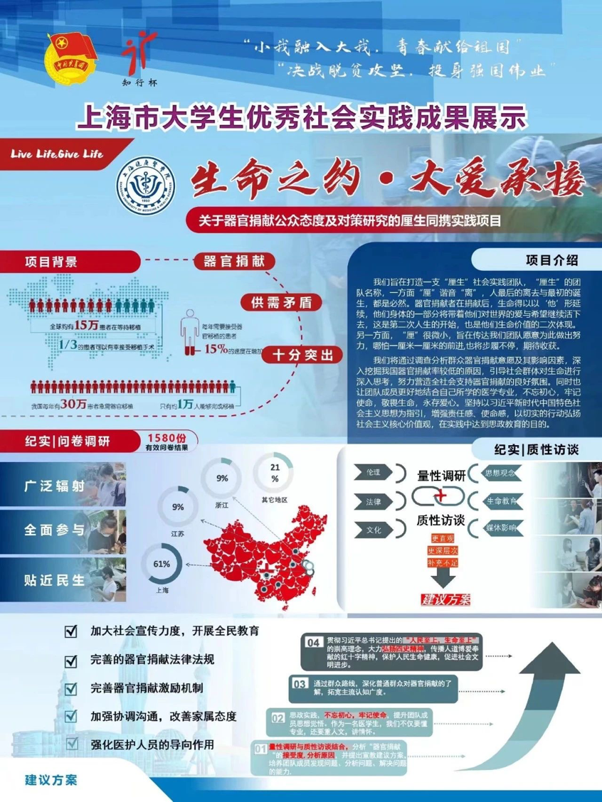除此以外,在新冠肺炎疫情期间,她聚焦到了一群在临终之际仍然心怀大爱,将自己的器官捐献出去的人们,他们让生命得以延续,贯彻习近平总书记提出的“人民至上,生命至上”的理念。出于对自己所学专业和未来职业生涯的思考,依托指导老师宋莉娟安宁疗护和死亡教育的研究方向,在市级项目:生命与死亡教育系列课题研究的基础上,着手开展了《“生命之约,大爱承接”——关于器官捐献公众认知、态度及对策研究》的社会调研项目,项目获得2020年上海市“知行杯”社会实践项目大赛二等奖,她作为项目负责人,获2020年“知行杯”上海市大学生社会实践项目大赛“先进个人”,并在实践过程中积极求索,发表论文《公众对器官捐献认知及意愿的调查研究》。