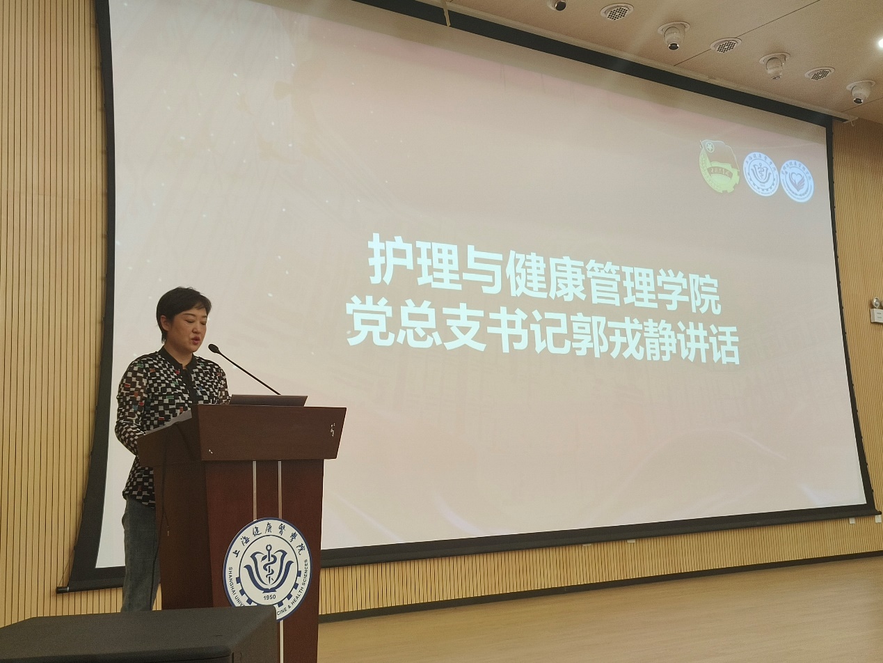 最后是郭戎静致辞,她代表学院党总支对团总支的积极工作表示感谢,她希望广大团员青年要紧密团结在团组织周围,自觉加强个人综合素质的培养,将个人的发展成长融入于国家民族进步事业中,秉承“厚德至善 健行康民”的校训,成为具有“五C、四会、两强、两高”的临床一线岗位胜任力的高素质应用型本科护士和具有基本的健康服务工作能力、初步的教学能力、管理能力及科研能力的高素质应用型专门人才,沉下心来学习、潜下心来感悟,以学铸魂、以学促干,让青春在伟大奋斗中绽放光芒。