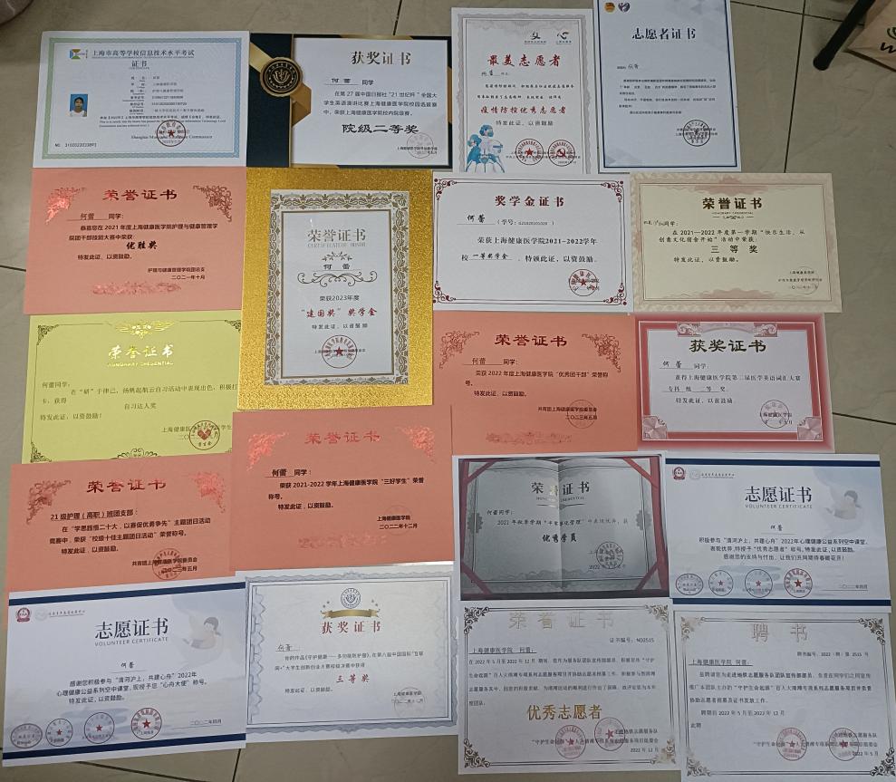 曾获2022-2023学年国家奖学金、2023年度“建国奖”奖学金、连续2年校一等奖学金、2021-2022学年校“三好学生”、2022年度校“优秀团干部”、2022年“清河沪上,共建心舟”心舟大使、优秀志愿者、2022年 疫情防控优秀志愿者、2022年 “研”与律己,扬帆起航云自习活动 自习达人奖、2021年“半军事化管理”优秀学员,2023年上海市“星光计划”职业院校技能大赛“健康与社会照护”项目一等奖、2022年第七届“亿学杯”全国大学生英语词汇及综合能力大赛省三等奖、2022年第二十七届中国日报社“21世纪杯”全国大学生英语演讲比赛院级二等奖、2022-2023学年 第八届中国国际“互联网+”大学生创新创业大赛校级决赛三等奖、2022年第二届医学英语词汇大赛校二等奖、2021年 校团干部技能大赛优胜奖、2023年“学思践悟二十大,以赛促优勇争先”“校级十佳主题团日”。