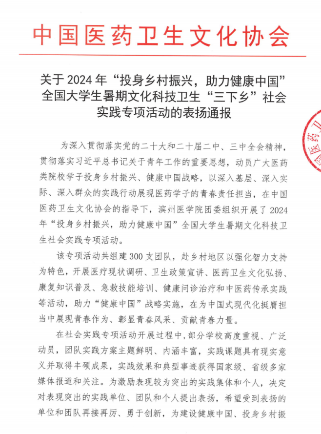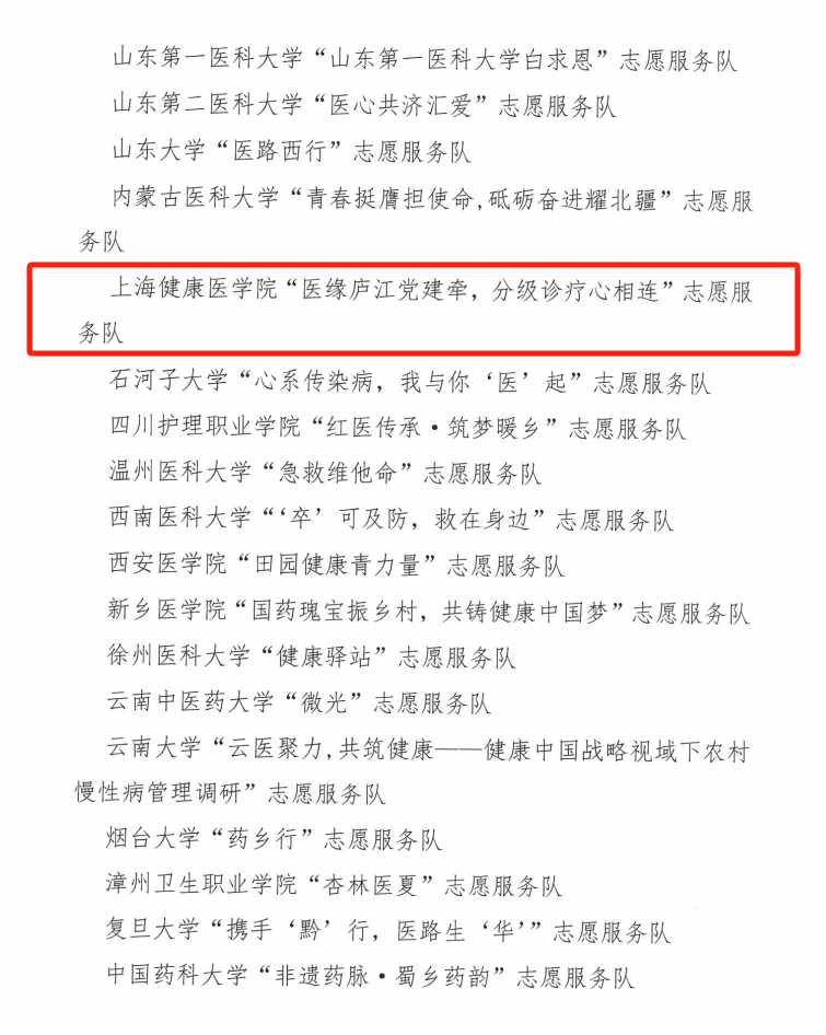 近日,由中国医药卫生文化协会指导,依托全国医药类高校共青团工作联盟组织开展的2024年全国大学生暑期文化科技卫生“三下乡”社会实践“投身乡村振兴,助力健康中国”专项活动,得到医药类院校师生的大力支持,同时对表现较为突出的实践集体和个人予以表扬通报。bwin中国官方网站的人人主动健康(AHFE)团队组建的bwin中国官方网站“医缘庐江党建牵,分级诊疗心相连”志愿服务队获评全国“表现突出团队”(上海仅2支团队获评)。