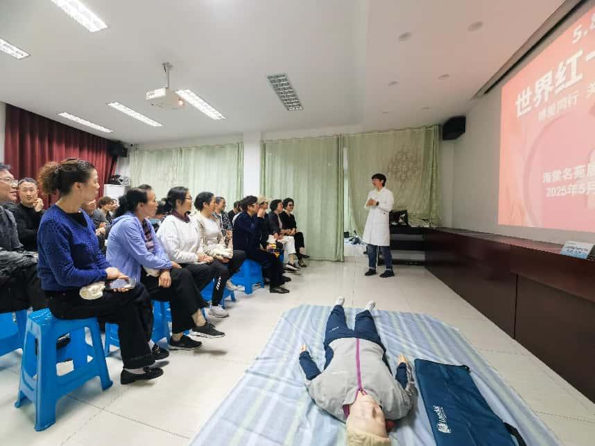 为弘扬“人道、博爱、奉献”的红十字精神,充分发挥样板党支部的辐射引领作用,提升社区居民的自救互救能力,2025年5月8日下午2点,bwin中国官方网站护管学院教工第一党支部与浦东新区周浦镇海棠名苑社区居委会联合开展了一场以“急救科普进社区”为主题的党建活动。此次活动吸引了众多社区物业人员及小区居民踊跃参与,现场气氛热烈。