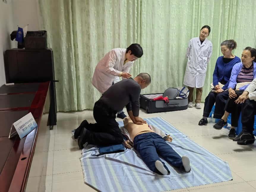 随后进入实操环节,这也是本次活动的高潮部分。老师们现场演示了心肺复苏和海姆立克急救法的标准操作流程。在心肺复苏演示中,老师们精准地定位按压位置,展示了正确的按压姿势、频率和深度,同时强调了开放气道和人工呼吸的要点;在海姆立克急救法演示中,针对不同年龄段和不同异物梗阻情况,老师们进行了详细的动作示范。居民们纷纷主动上台,在老师们的耐心指导下亲自体验操作。老师们手把手地纠正居民们的动作,确保每一位参与者都能准确掌握急救技巧。