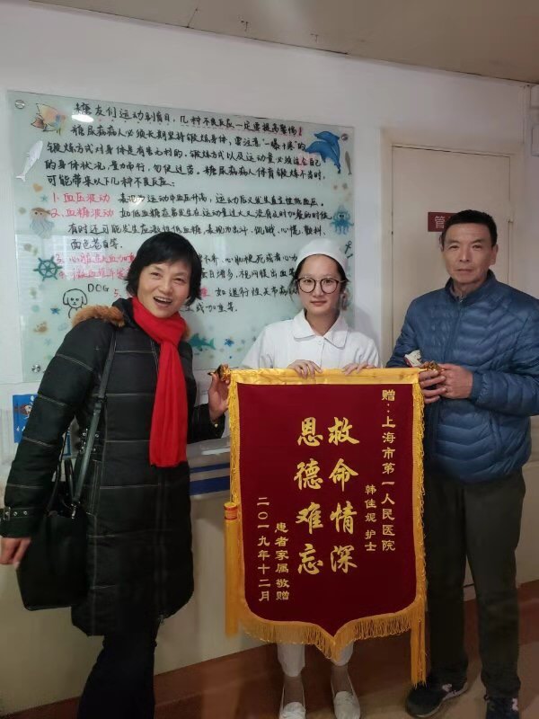 2019年12月15日,在上海市第一人民医院实习的16级学生韩佳妮,在与家人外出就餐时,发现隔壁桌的一个中年男子瘫坐在椅子上且家属呼之不应。出于护士的敏感性,她立马跑到该男子的身边触摸颈动脉,同时观察他的呼吸状况,发现他已经没有了脉搏和呼吸。她一边把他从椅子上搬下来平放在地上,一边指挥旁边慌乱无措的家属拨打120急救电话。之后,就按照学校和临床上学习的急救方法,为他做起了CPR急救。经过一轮CPR循环后,男子的心跳呼吸都恢复了,意识也清楚了。她一直在患者的身边观察他的生命体征,直到救护车到达现场,将这位患者送去了医院。