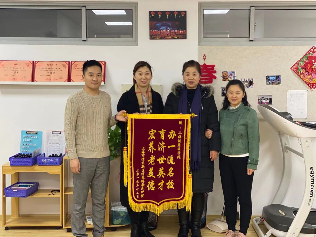 2019年12月26日上午,上海市浦东新区浦惠鹤韵养护院办公室主任田翠萍老师和康乐业务部主任沈春辉老师将一面写着“办一流名校、育济世英才、宏养老美德”的锦旗送到了我们bwin中国官方网站,并对我院志愿者提供的服务,以及对志愿者们的无私奉献和热情投入表示感谢和肯定。