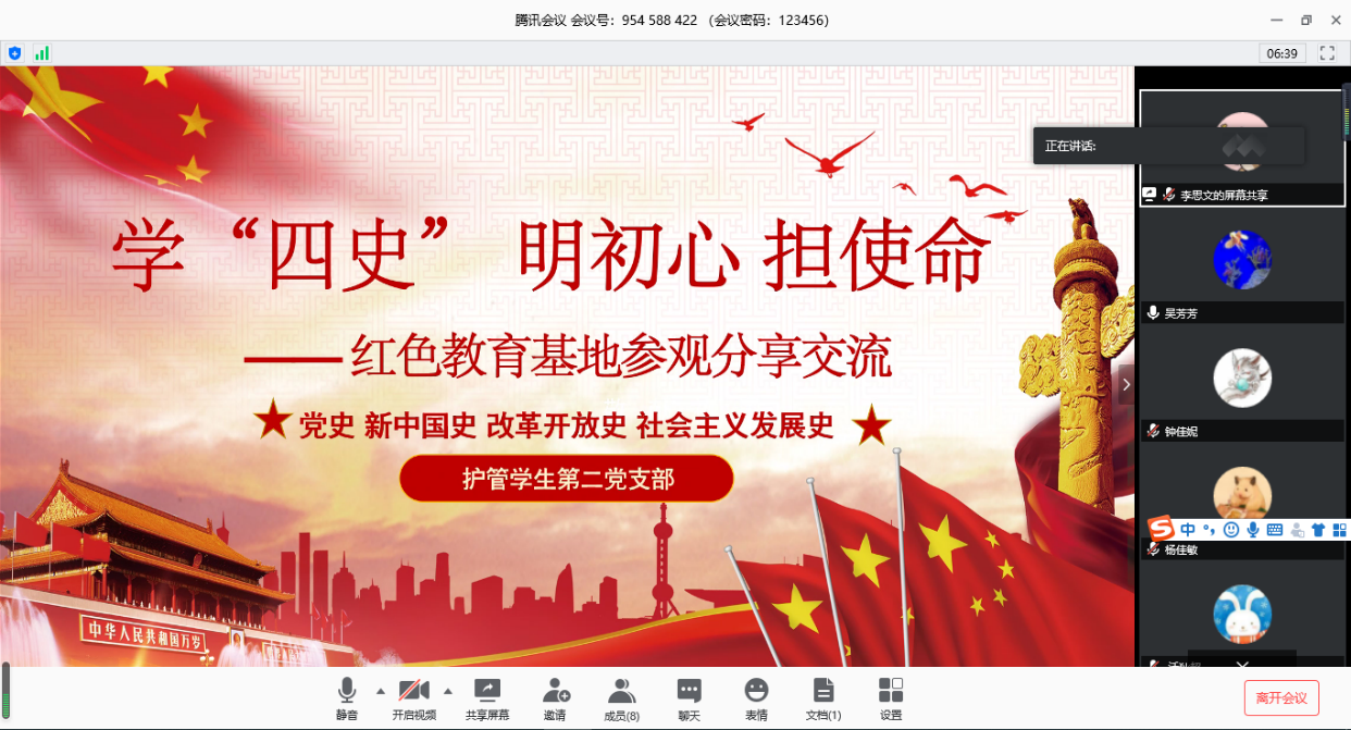 加强“四史”学习要汲取“历史营养”,为深入落实“四史”教育,学生第二党支部师生党员利用假期各自参观了身边的红色景点,通过红色资源夯实信念之基,补足精神之钙。2020年8月13日下午14:00学生第二党支部通过腾讯会议举办了以 “学‘四史’ 明初心 担使命”为主题的党日活动,分享交流了红色基地的参观感悟。