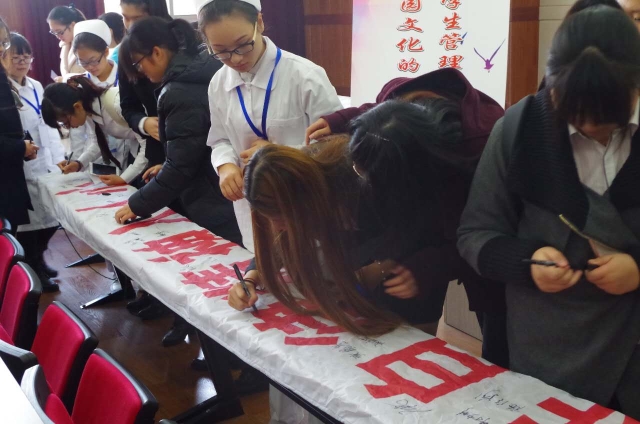 大会末,在护理学院学生会自律部部长沈承雨的号召下同学们纷纷在横幅下签下自己的名字,以表示自己的决心。
