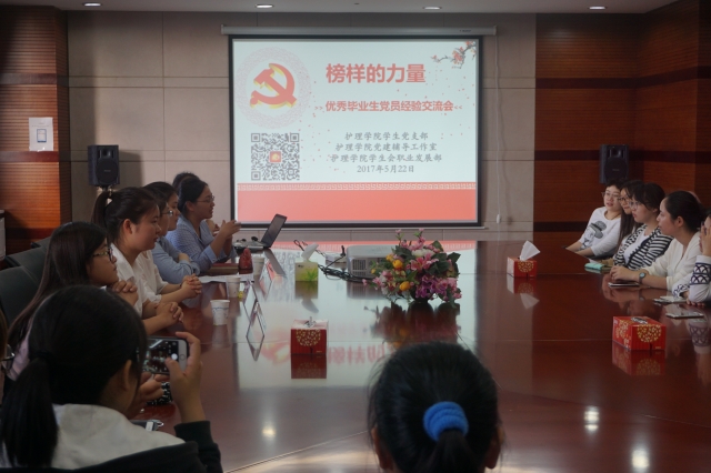 2017522日下午,“榜样的力量”优秀毕业生党员经验交流会在9808教室举办。此次交流会邀请了优秀毕业生党员沈慧婷学姐、余琦玮学姐和潘瑒学姐,护理学院学生党支部书记段慧丹老师、辅导员吉洁老师和李娟娟老师出席本次交流会。