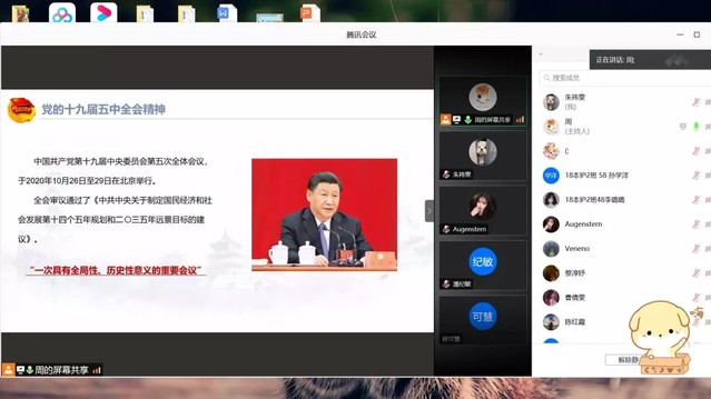 20201119日,20级护理(本科)4班在南苑E202室通过观看讲座视频、和听PPT讲解深入学习了《学习宣传贯彻党的十九届五中全会精神》、《学习习近平总书记在第三届进口博览会的讲话精神》以及《学习习近平总书记在浦东开发开放30周年大会上的讲话精神》。