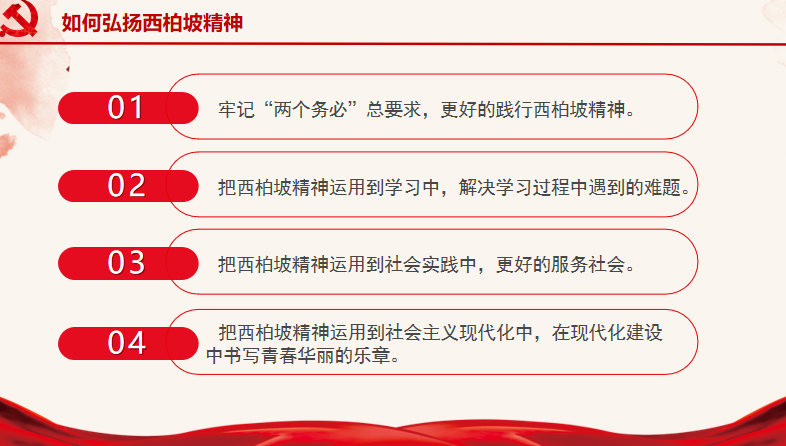 徐嘉翊同学向大家介绍作为新时代青年要如何弘扬西柏坡精神与其深远意义,她指出:弘扬西柏坡精神要牢记“两个务必”总要求、把西柏坡精神运用到学习中,解决学习过程中遇到的难题;把西柏坡精神运用到社会实践中,更好的服务社会;把西柏坡精神运用到社会主义现代化中,在现代化建设中书写青春华丽的乐章。这宝贵精神既一脉相承又与时俱进,是激励我们党顽强奋斗、不断发展壮大的精神动力,是我们党立党兴党、执政兴国的宝贵精神财富,是新时代坚持和发展中国特色社会主义的坚强精神支撑。