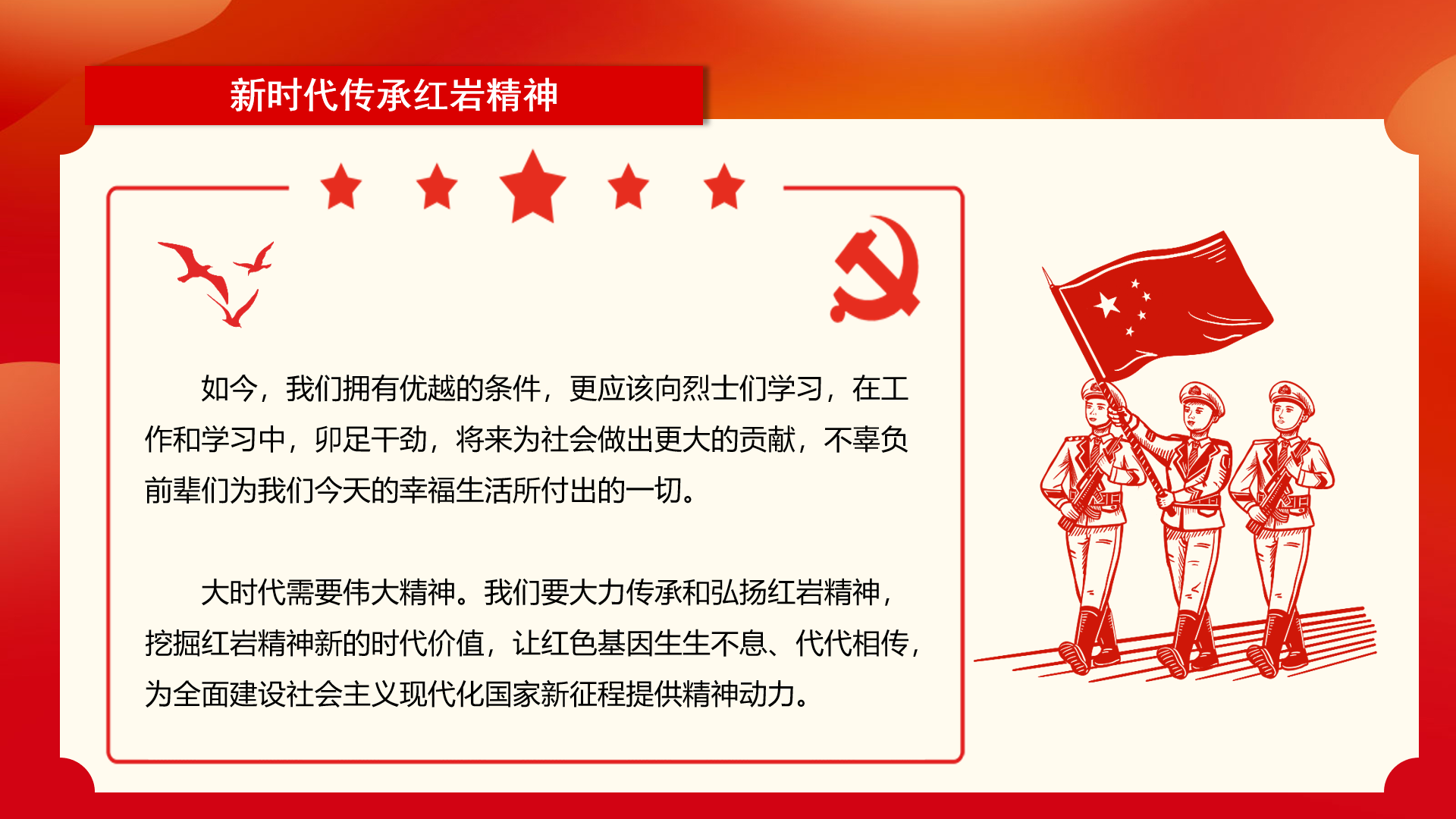 红岩精神植根于中华民族不屈不挠的民族精神的沃土,植根于几千年来中国人民身上所凝聚的传统美德,是我们中华民族伟大精神和传统美德的表现和升华,是宝贵的精神财富。