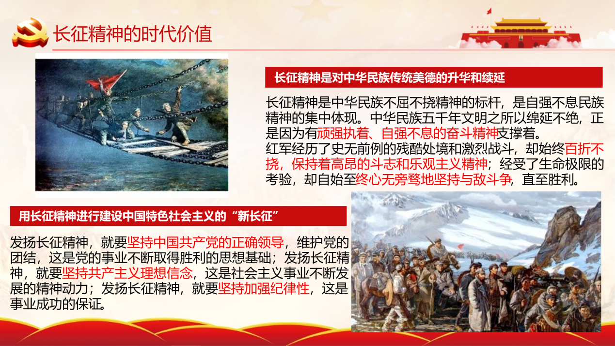 第二部分为长征精神的介绍。长征精神是对中华民族传统美德的升华和续延,长征精神是中华民族不屈不挠精神的标杆,是自强不息民族精神的集中体现。中华民族五千年文明之所以绵延不绝,正是因为有顽强执着、自强不息的奋斗精神支撑着。发扬长征精神,就要坚持共产主义理想信念,这是社会主义事业不断发展的精神动力;发扬长征精神,就要坚持加强纪律性,这是事业成功的保证。