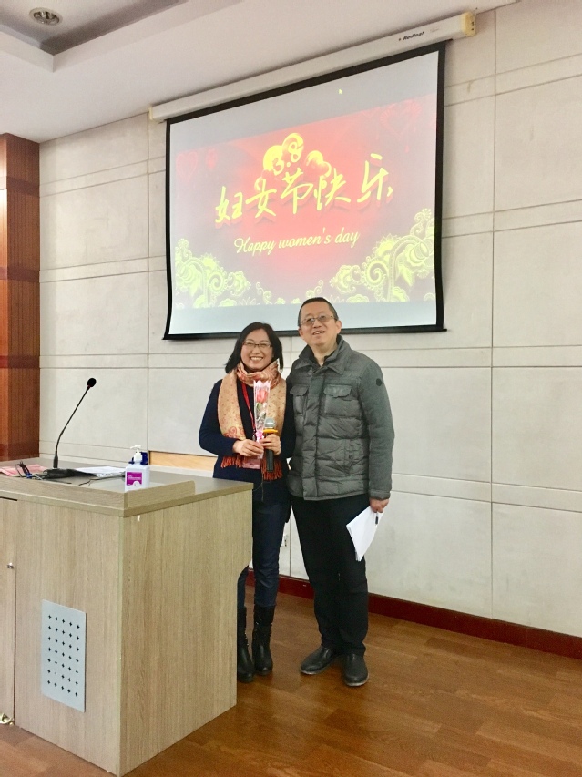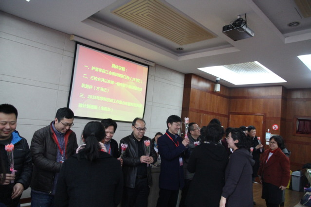 下午1点,学院教职工大会暨庆祝三八妇女节大会在9号楼106室召开,学院朱爱勇院长、广圣副院长两位男领导为学院的每一位女员工送上了芬芳的玫瑰,同时送上的是对全体女教师的祝福。单丝不成线,独木不成林,红花还需绿叶衬。大会的最后,女教师代表也向全体男教师献上了鲜花,并集体拍照留念。