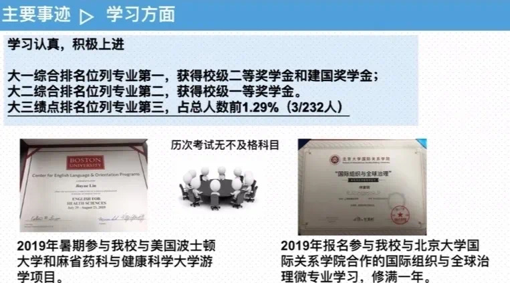 而后是18级健康服务与管理(本科)2班的卢朔同学。在学习方面,卢朔同学曾荣获两次校奖学金、建国奖学金和国家励志奖学金。