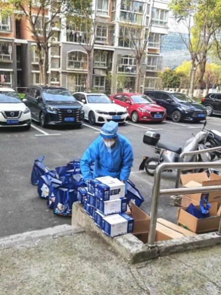 吴凡同学家住在“重灾区”之一的闵行区,作为第一批进入封控模式的小区,核酸检测是常态,志愿者们需要随时待命。和居委干部一样,起早摸黑,有时早上5点不到集合,开展秩序维护,现场登记,扫码等志愿服务,化身“大白”配合医护人员贴标签,剪棉签,提高筛查效率。根据居委安排,每天的任务也不同,不管是什么活儿,核酸检测、信息排摸、小区巡逻、物资分发、在楼群中积极发声、答疑解惑……她和志愿者们“照单全收”,在做好每件小事中彰显为民服务的情怀。为严格落实“人不流动、足不出户”,她还担当了值守楼道的志愿者,成为“楼宇守望者”,看好楼、收垃圾、发快递,耐心劝阻个别想要出门的人,也得到了大部分居民的理解。