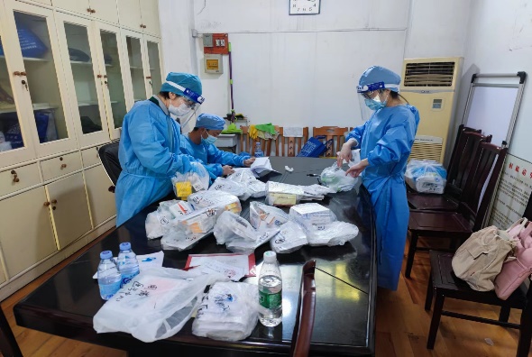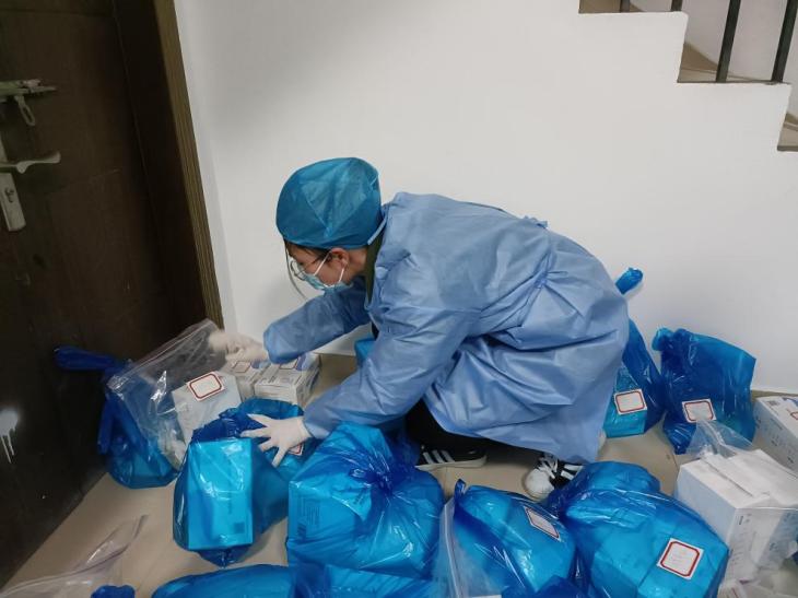 在分发抗原自检材料时,一部分老年人由于配药难的情况向她寻求帮助,在她与居委汇报情况后,得出了解决方案:可以将自己的医保卡和所要配的药品包装,放在袋子中,再由志愿者,统一放到居委会,由专人前往医院,进行配药。这样就解决了老年人在管控期间,无法出门配药的问题。