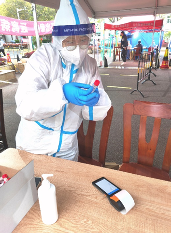 在严峻的疫情面前,21级护理(高职)班入党积极分子何蕾同学,加入到了战“疫”的征途中,积极报名参加了她所在的奉贤区南桥镇社区的疫情防控志愿者工作。
