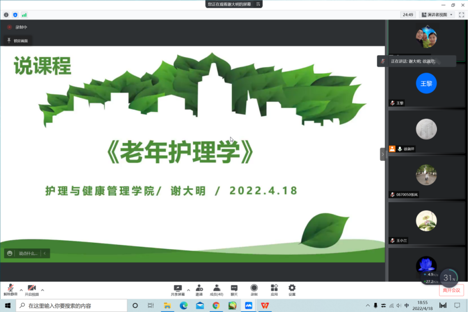 按照计划,护管学院先后组织了三场说课程、一场说学生的专项活动,参与人次达148。学院郭戎静书记、朱爱勇院长带领全体领导班子成员全程参与,并邀请周进祝教授全程指导,学校教务处王莉处长以及学生处张燕老师倪扬扬老师也分别参加了说课程、说学生活动。护管学院由周冬梅、谢大明、蔡妤柯、朱闻溪、郑国华、郭丽君等6位老师就护理学专业、健康服务与管理专业的六门核心课程建设进行了汇报,胡雪东、刘源璞2位老师分别就两个专业学生管理开展了说学情。老师们进行了精心的准备,也得到了点评专家和与会领导的高度评价,特别是周进祝教授对每一位老师的汇报都进行了细致的点评,并以本科评估指标为参照给全学院老师们进行了专题辅导,使得学院全体教师对本科评估指标有了更深入的理解。