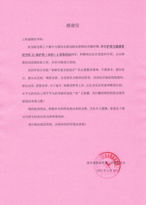 在本次疫情防控工作中,bwin中国官方网站共有212位同学在校外参与了志愿服务工作,他们活跃在社区、街道、方舱,活跃在各类志愿者岗位上,展现了护管学子的优秀风采,守护人民健康的同时充分践行了我院“厚德济生,护康健行”的院训。同时收到了来自中共上海松江区委组织部、中共闵行区浦锦街道工作委员会等各区各类组织的感谢信,感谢的话语中蕴含着的是情感与希望的累积,而我们都能看见“爱之花开放的地方,生命便能欣欣向荣。”